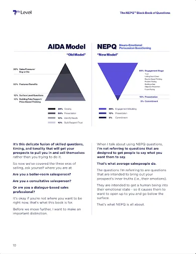 Neuro-Emotional Persuasion Questioning (NEPQ) is a counterintuitive approach to sales, that allows you to close more deals with a calm, effortless confidence without resorting to the outdated, pushy, and often sleazy tactics that can feel like you're being forced to put your ethics on the line to close the sale.